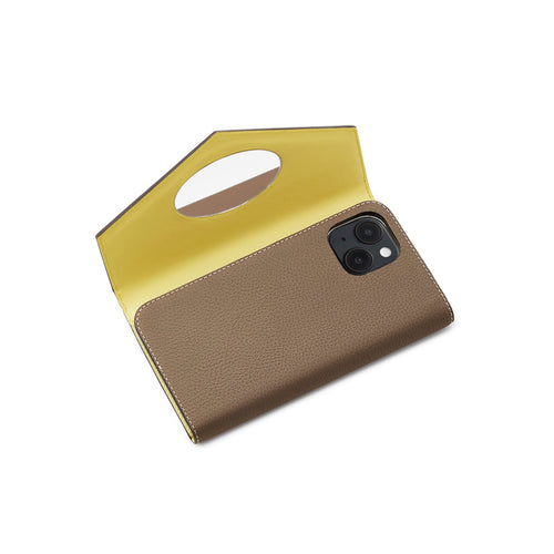 iPhone 14 Diary Case with Mirror Shrink Leather (Etoupe × Yellow)